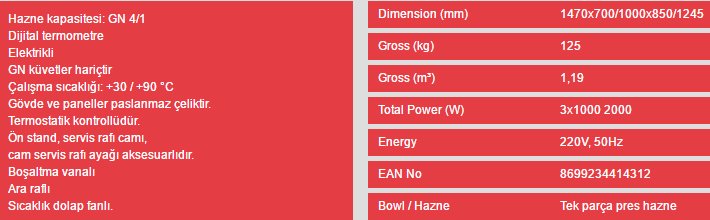 Hızlı ve hijyenik olması açısından tepsilik tezgahı, üst standı bulunan benmari tamamen paslanmaz çelik ile üretilmektedir.