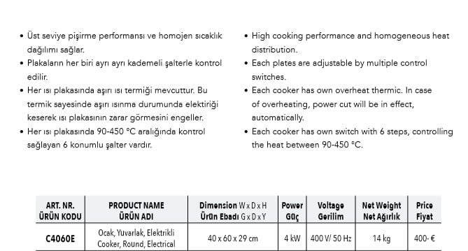 Elektrikli Yemek Pişirme Ocağı Çiftli Sanayi Mutfak Tipi Kalitegaz C4060E